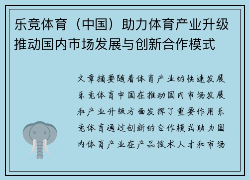 文章摘要:随着体育产业的快速发展,乐竞体育(中国)在推动国内市场发展和产业升级方面发挥了重要作用。乐竞体育通过创新的合作模式,助力国内体育产业在产品、技术、人才和市场等多个领域取得突破。在整篇文章中,我们将从四个方面详细探讨乐竞体育如何助力体育产业升级,分别是:推动技术创新与产品升级、培养专业化人才和团队建设、创新体育产业合作模式、提升体育产业整体市场竞争力。通过这些战略举措,乐竞体育不仅加速了国内体育市场的发展,还为中国体育产业的全球化与持续创新奠定了基础。文章最后,将对乐竞体育在推动中国体育产业升级中的角色进行总结与展望。