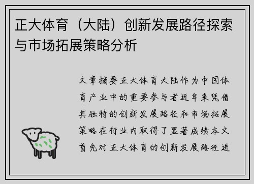 正大体育(大陆)的创新发展路径和市场拓展策略无疑为中国体育产业的发展提供了宝贵的经验。通过不断的科技创新、产品创新及管理创新,正大体育不仅在国内市场取得了显著成绩,也逐渐走向了国际化。在品牌建设、渠道拓展与合作方面,正大体育始终保持敏锐的市场嗅觉,利用多元化的策略迅速占领市场份额。